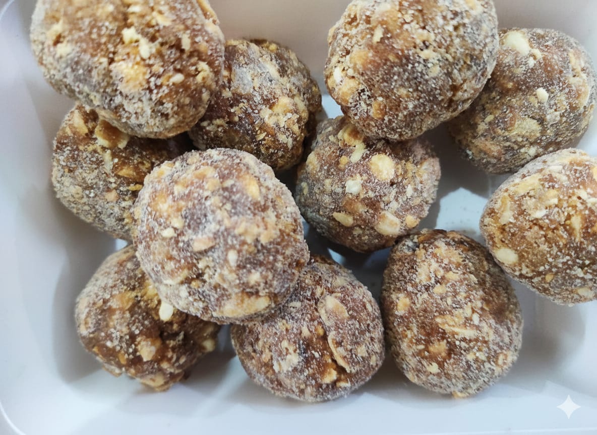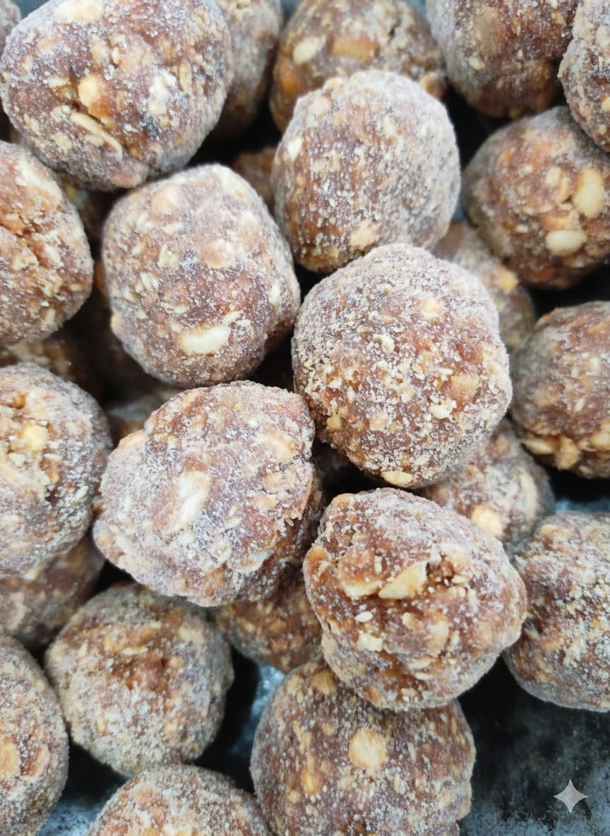 Made out of Fried peanut.,fried rice,sesame seeds,moong dal, jaggery, dry coconut ,which are good for health